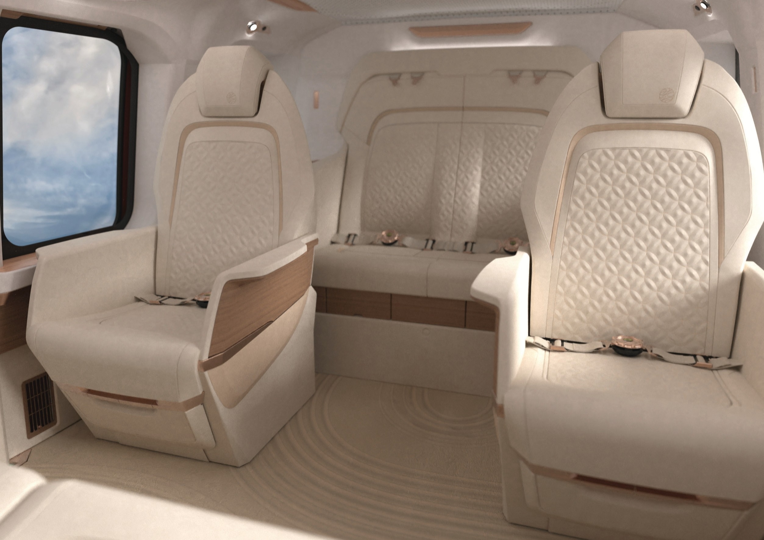 The exterior of the helicopter shines beautifully in colors inspired by “the rising sun”, which symbolizes Japan. The spacious interior is customized with finishes inspired by auspicious Zen gardens and interlocking Shippo circle patterns to create a luxurious ambience.
