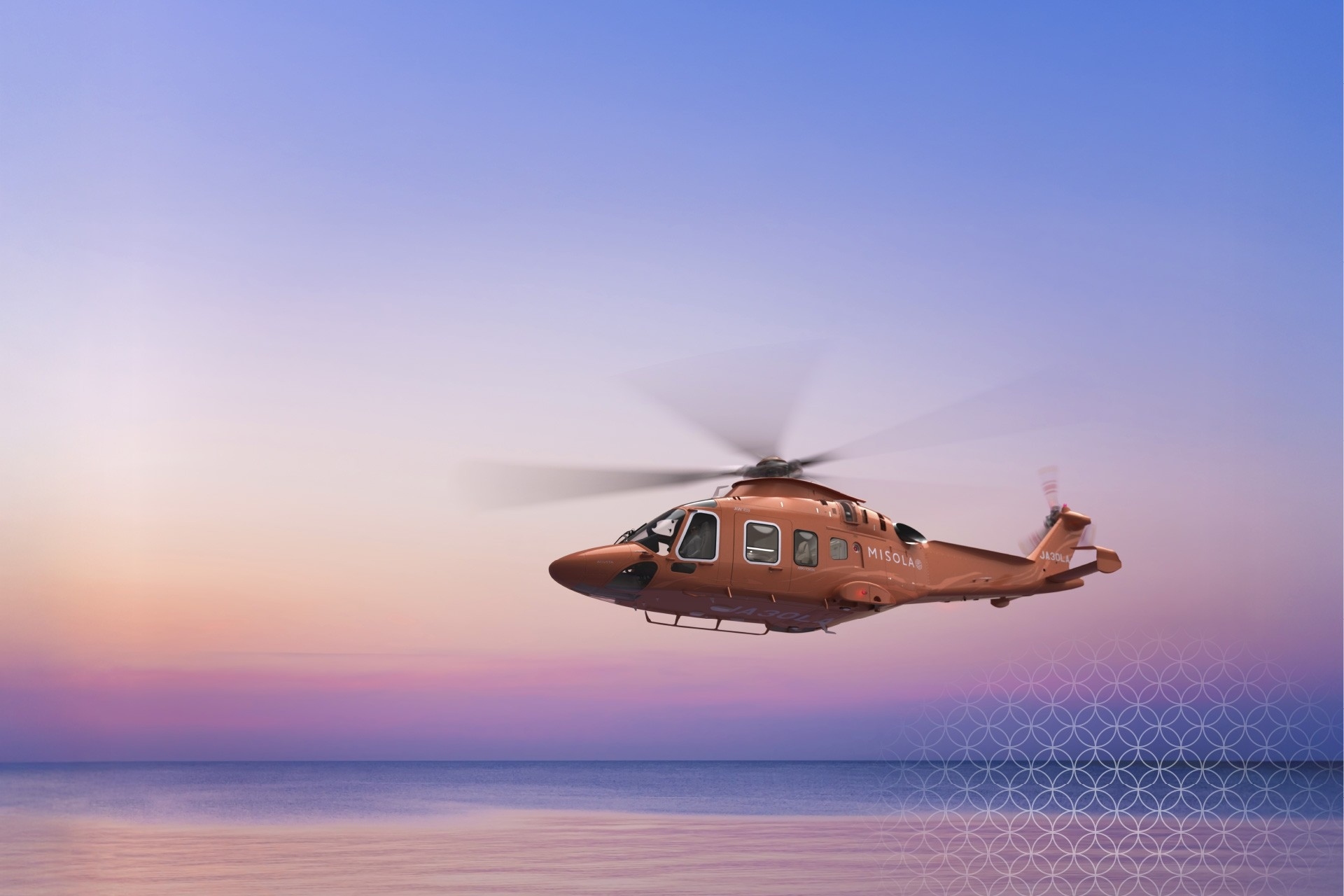 The AW169 flying against a backdrop of “the rising sun,” which inspired the aircraft's color scheme -