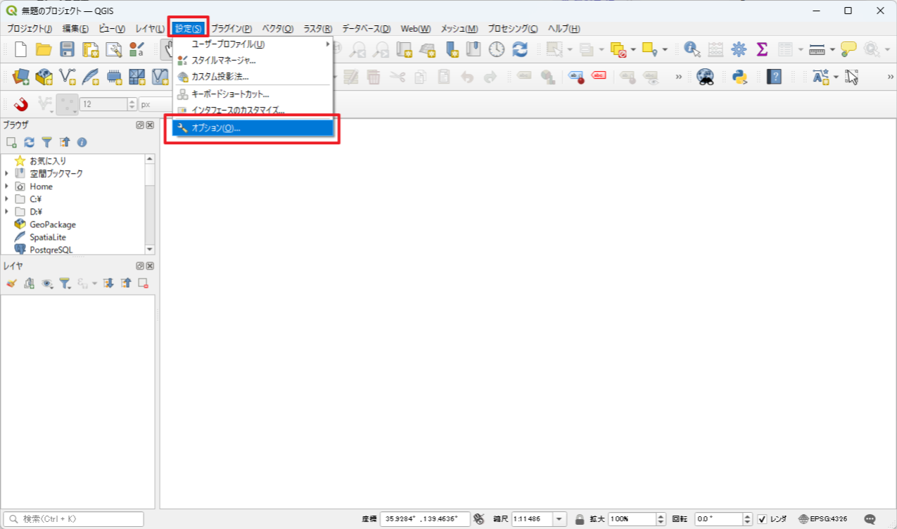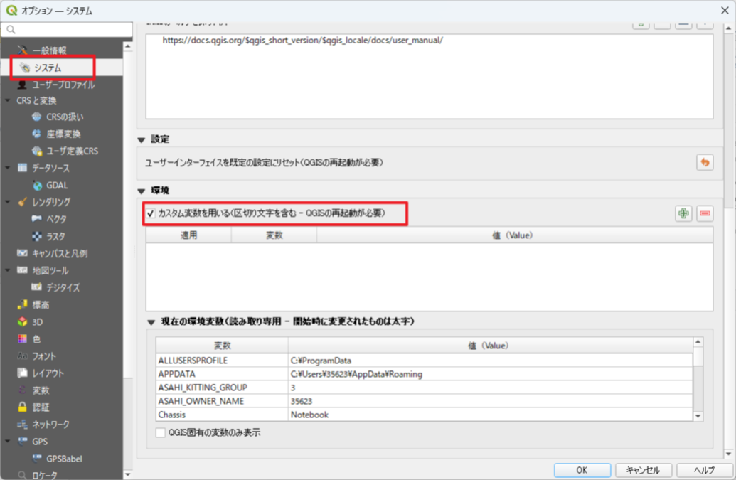 再度QGISを起動して、メニュー「設定」>「オプション」で「システム」を選択します。