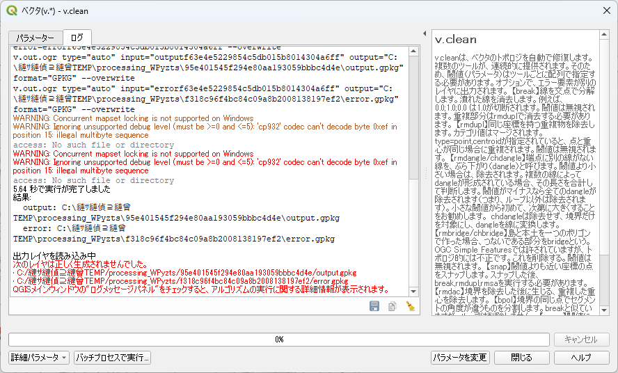 「v.out.ogr type="auto" input="error61a4af3386fc42128cb88fc50cae13bd" output="C:\縺サ縺偵⊇縺曾TEMP\processing_WPyzts\d3e874629f77401a8a58c6e815a01284\error.gpkg" format="GPKG" --overwrite」とありますので、TEMPフォルダにGeopackageファイルを作ろうとしている処理でエラーが発生しています。(パソコンの環境によって、日本語が文字化けしている場合もありますし、文字化けしない場合もあります)