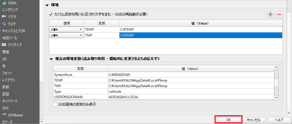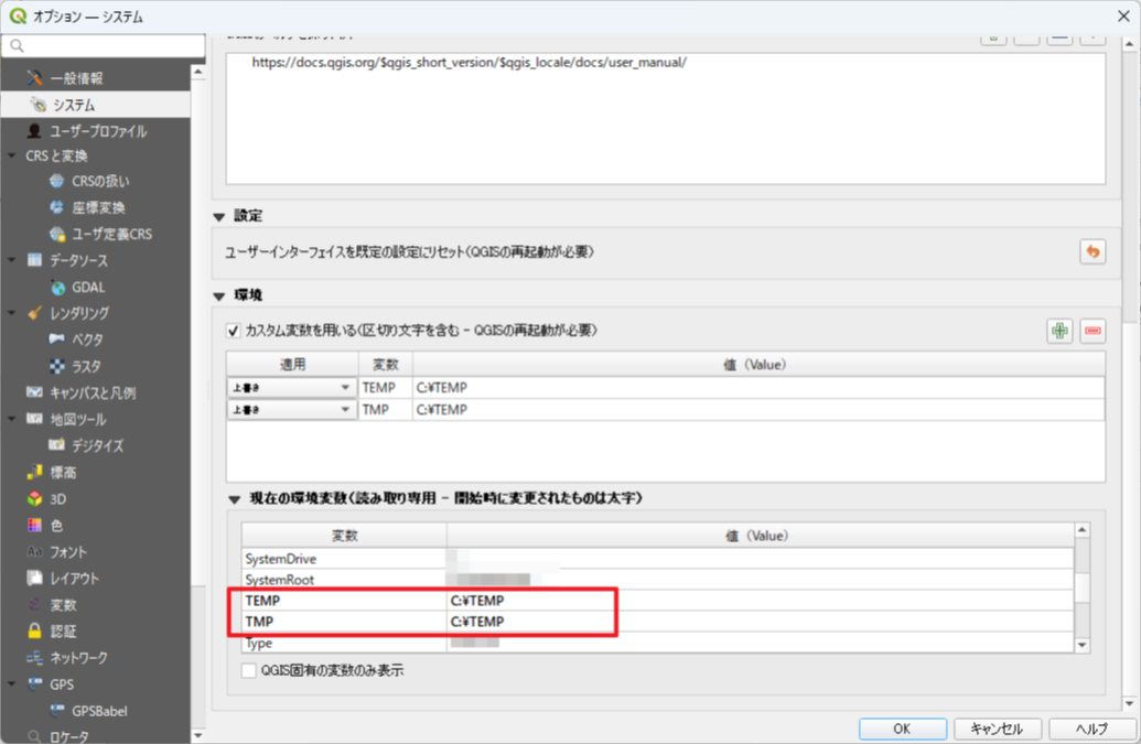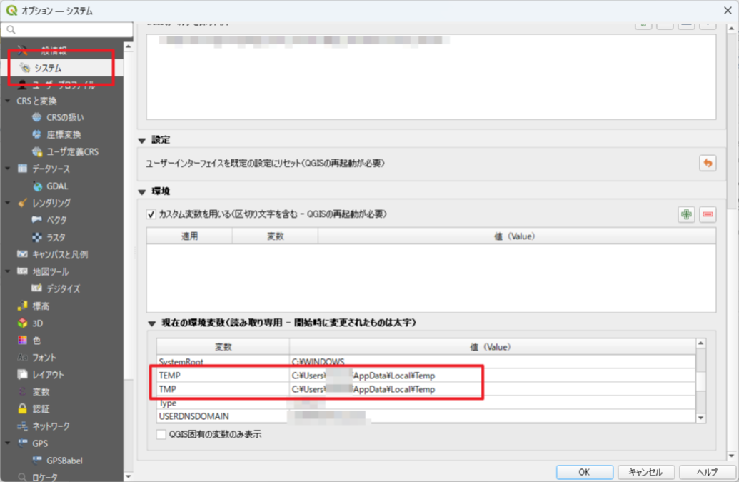QGISで一時保存フォルダ(TEMPフォルダ)を設定