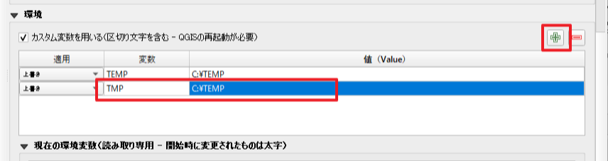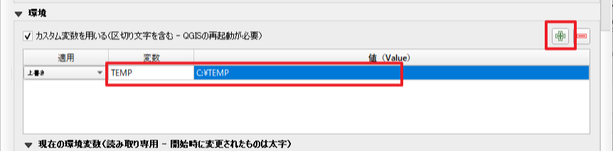 「+」ボタンをクリックして行を追加して、「適用」は「上書き」を選択し、「変数」に「TEMP」、「値」に「C:\TEMP」と入力します。