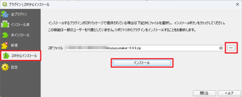 3.「ZIP からインストールする 」▶ […](参照ボタン) をクリックして、ダウンロードした「inyouzuMaker-x.x.x.zip」を指定し、「開く」▶「インストール▶「警告」:「はい」を選択します。