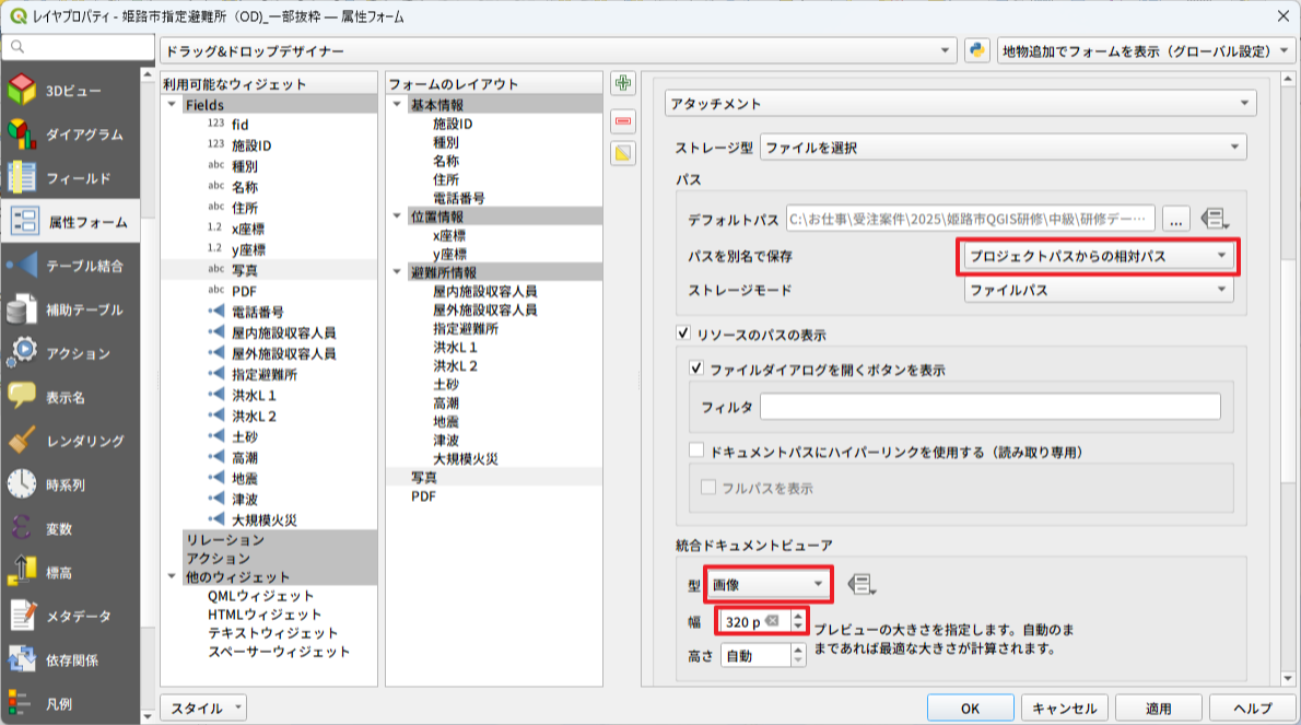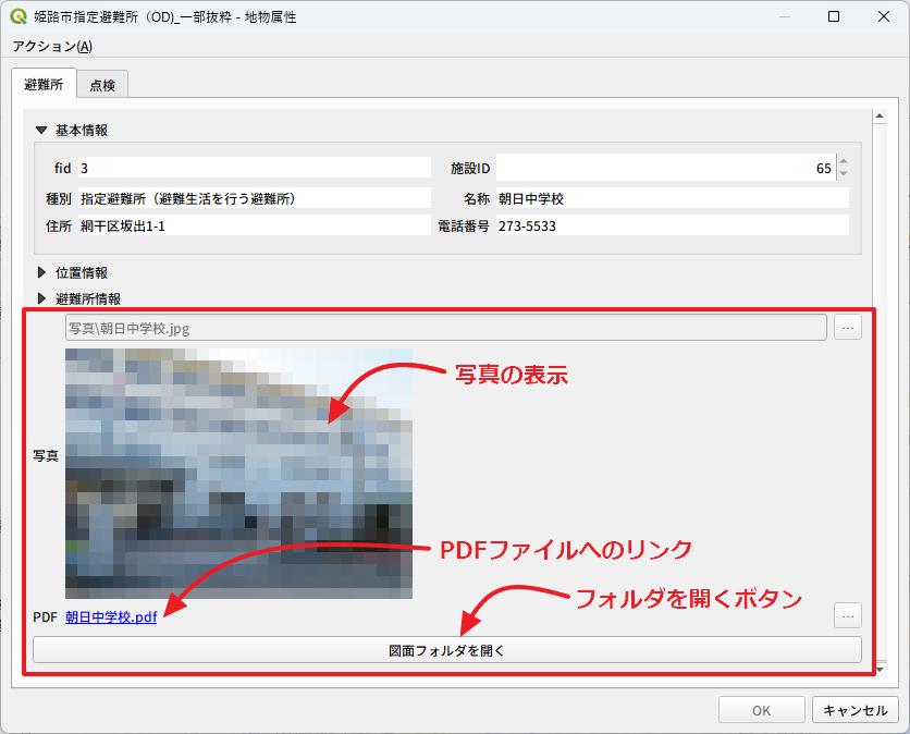 ・施設データの属性フィールド「写真」に「写真/〇〇.jpg」と該当するファイルのプロジェクトフォルダ以下のパスを入力する。