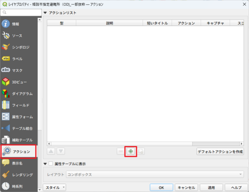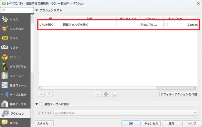 ちなみに、「属性テーブルに表示」にチェックすると、属性テーブルに「アクション」列が追加され、アクションを実行することができます。