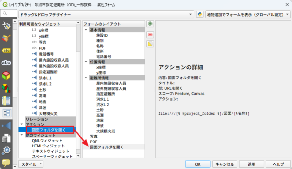 「図面フォルダを開く」をドラッグして、フォームレイアウトに登録します。