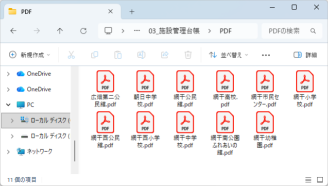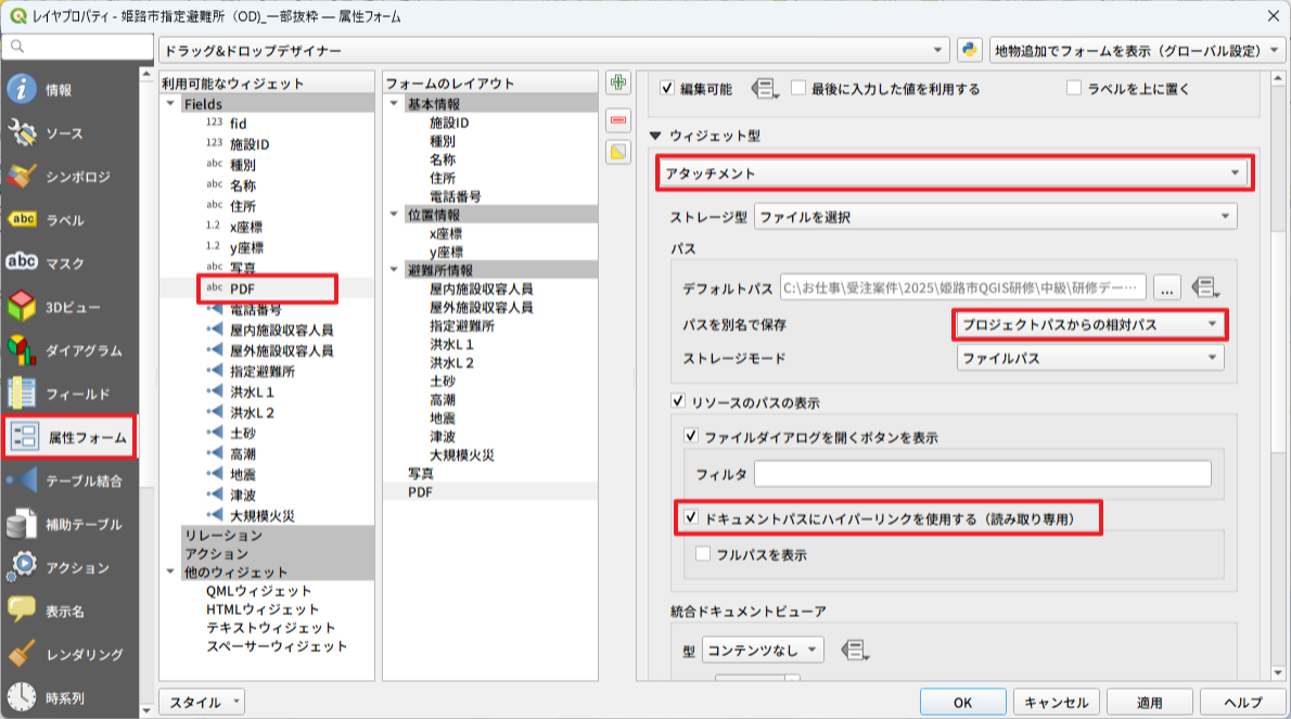 ・施設データの属性フィールド「PDF」に「PDF/〇〇.pdf」と該当するファイルのプロジェクトフォルダ以下のパスを入力する。