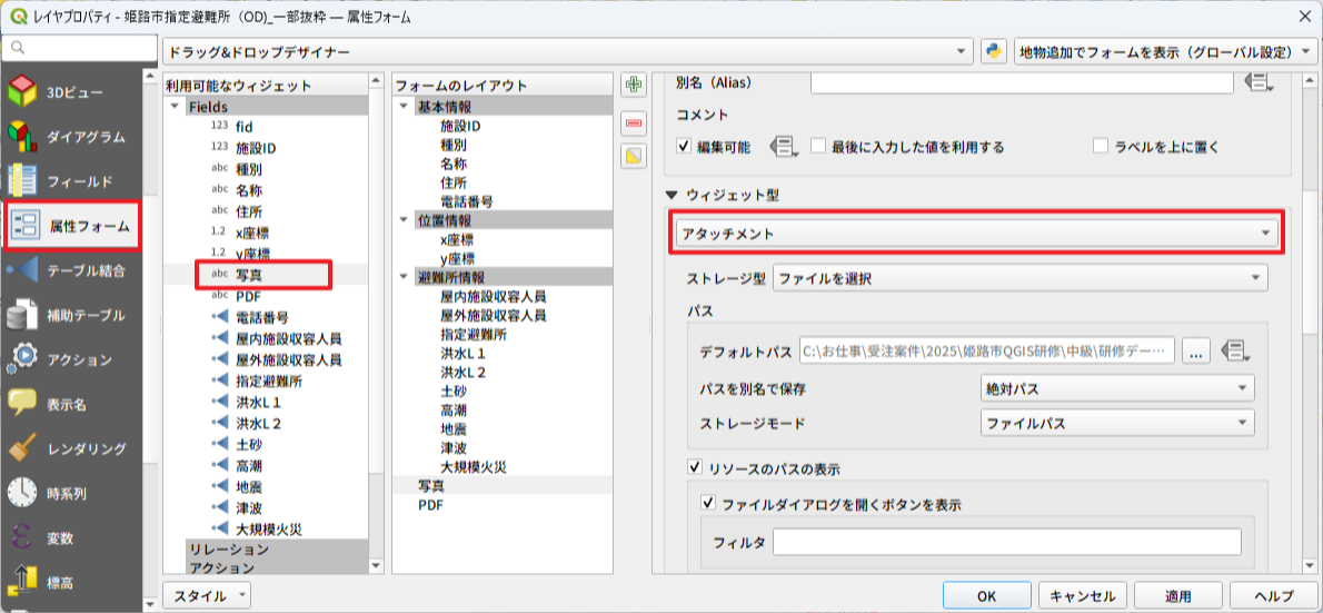 施設データのレイヤプロパティを表示して、「属性フォーム」を選択します。