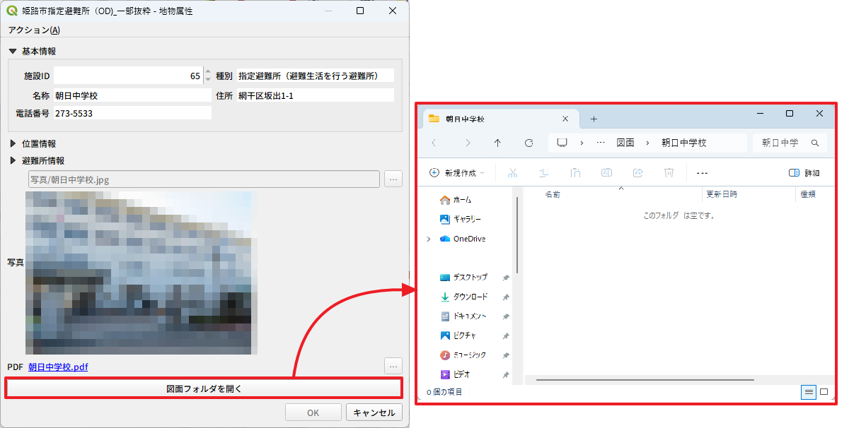 ツールバーの「地物情報の表示」をクリックし、図面フォルダに名称と同じフォルダが存在する地物をクリックします。
