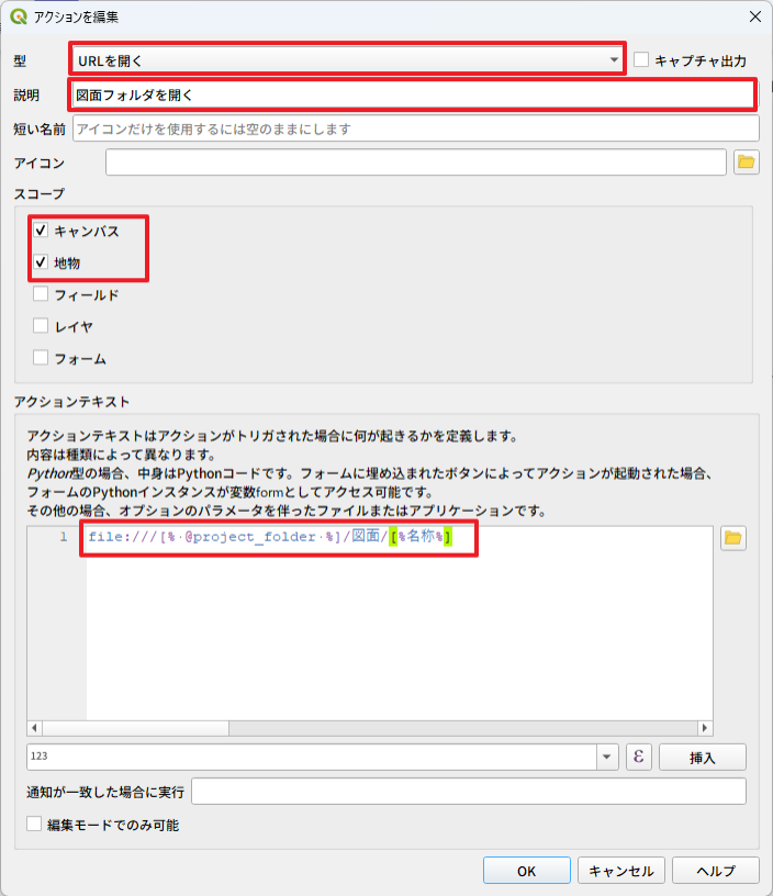 「アクションテキスト」に次の式を入力します。今回はプロジェクトフォルダにある「図面」フォルダ内の「名称」フィールドと同じ名前のフォルダを開く設定です。
