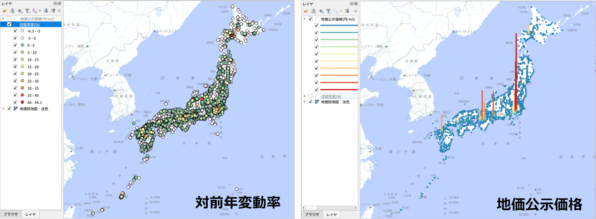 地価公示価格は、先程作成した「対前年変動率(%)」レイヤと同じデータを使います。