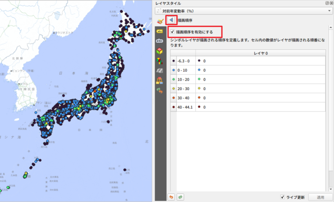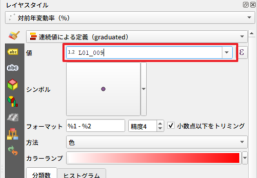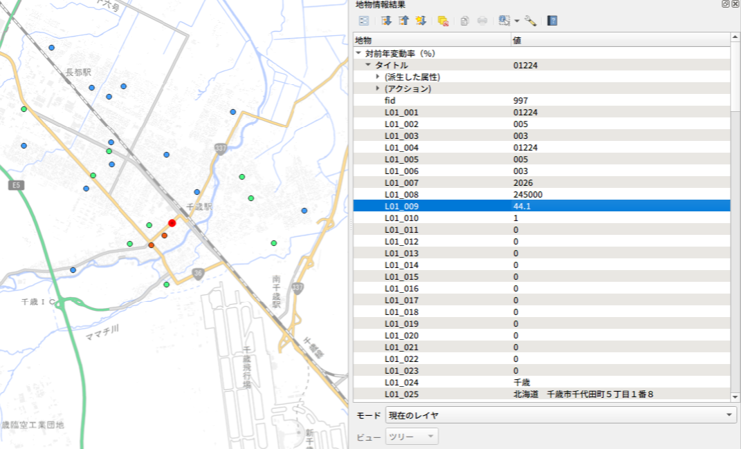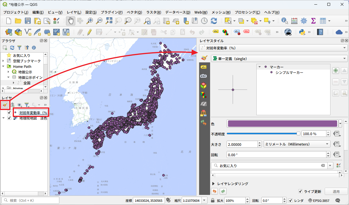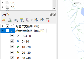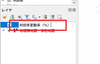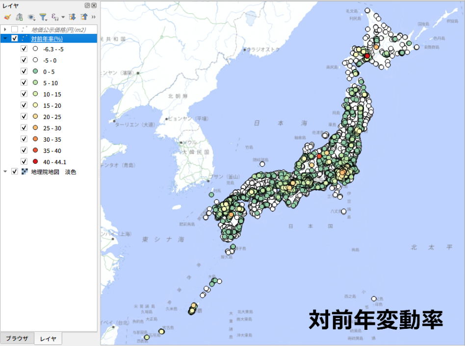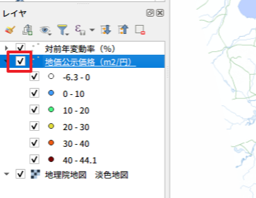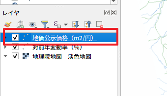 地価公示価格は、先程作成した「対前年変動率(%)」レイヤと同じデータを使います。