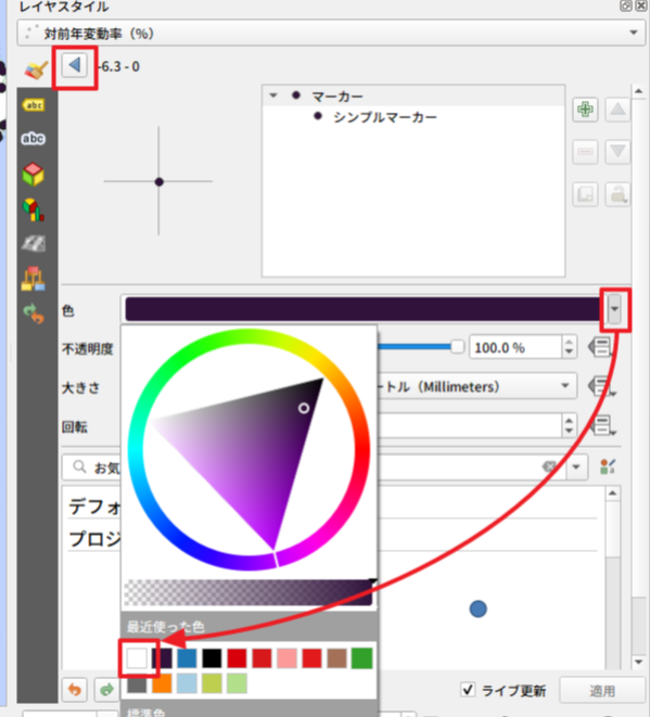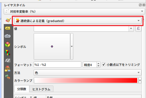 「対前年変動率(%)」レイヤを選択し、レイヤパネルの「レイヤスタイルパネルを開く」をクリックします。画面右側にレイヤスタイルパネルが表示されます。