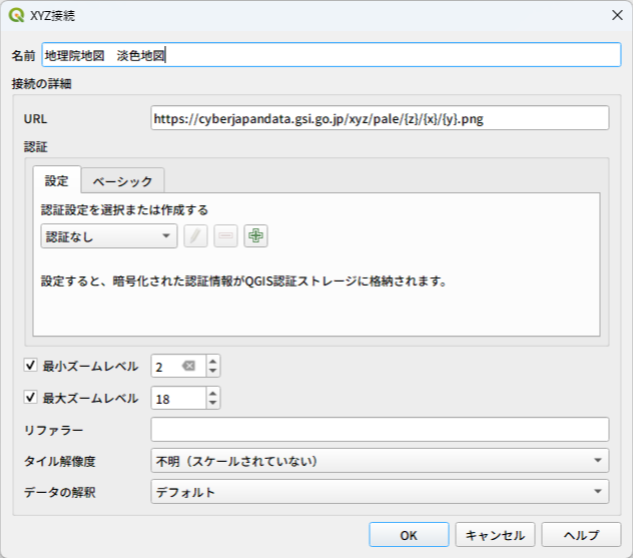 今回は「地理院地図 淡色地図」ですので、XYZタイルでの設定は、