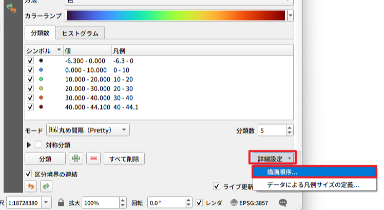 「分類数」を調整すると、色の分類を調整できます。いい感じの分類数に設定してください。