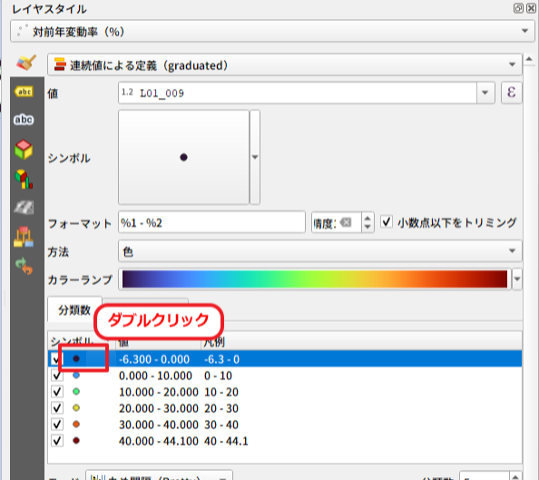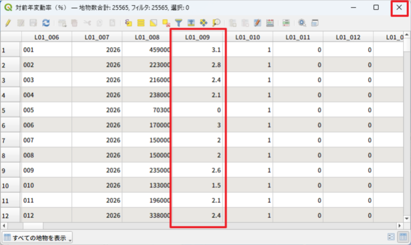 「対前年変動率(%)」レイヤを右クリックし、「属性テーブルを開く」を選択し、属性テーブルで「L01_009」フィールドに記録されている値を確認しておきます。