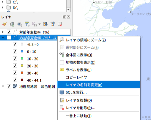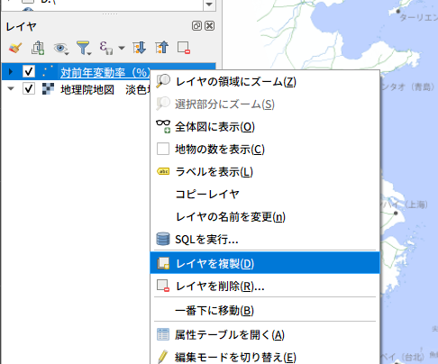 「対前年変動率(%)」レイヤを右クリックして「レイヤを複製」を選択します。
