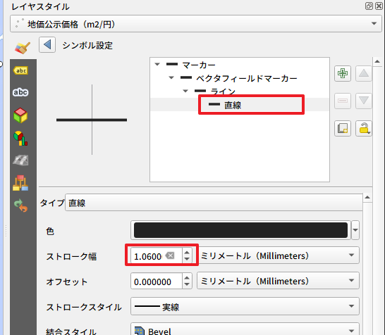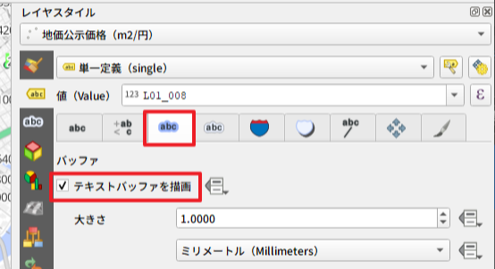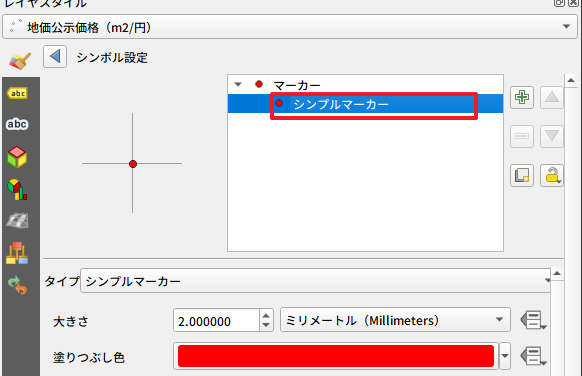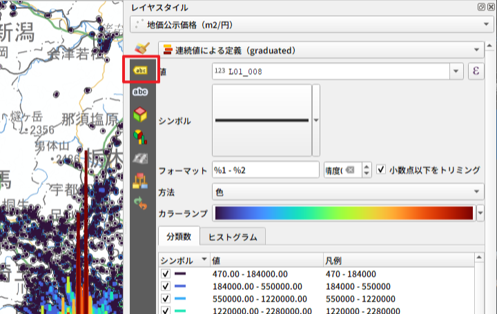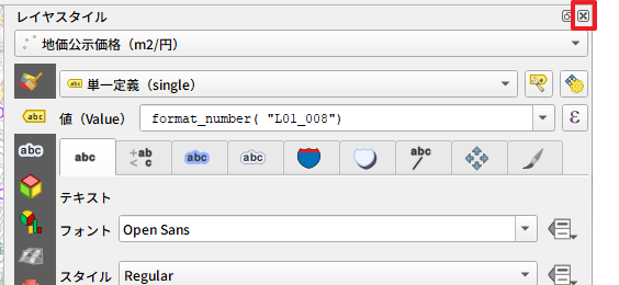 「地価公示価格(m2/円)」レイヤを選択し、レイヤパネルの「レイヤスタイルパネルを開く」をクリックします。画面右側にレイヤスタイルパネルが表示されます。