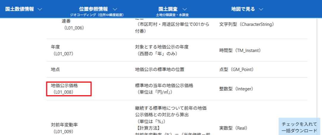 国土数値情報ダウンロードページに記載されている「地価公示価格」のフィールド名は「L01_008」となっています。
