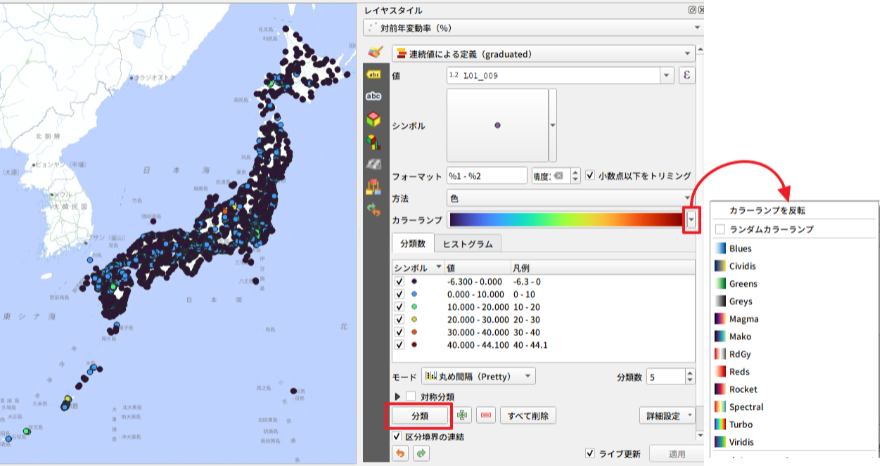 カラーランプを選択したら、「分類」ボタンをクリックすると、「分類数」に応じた色分け分類が行われます。