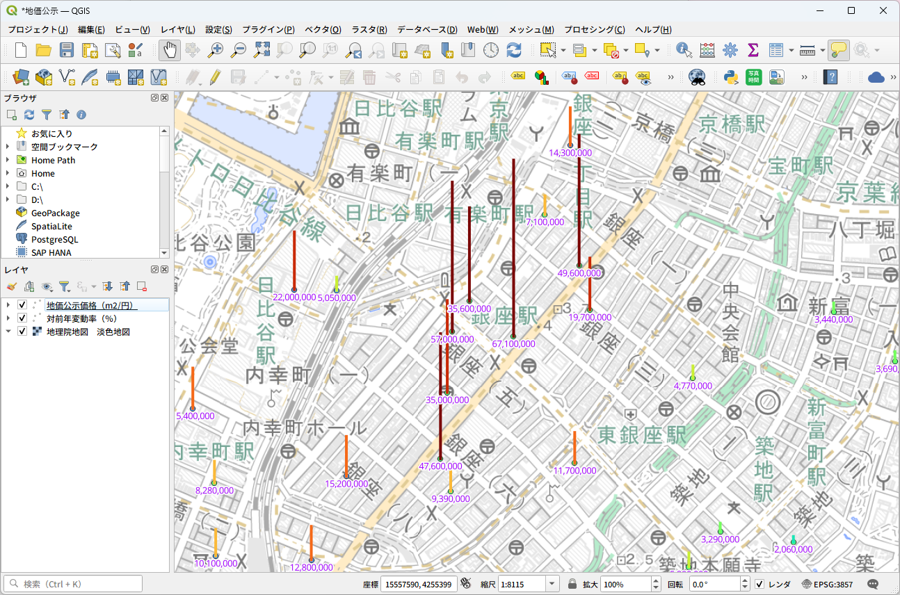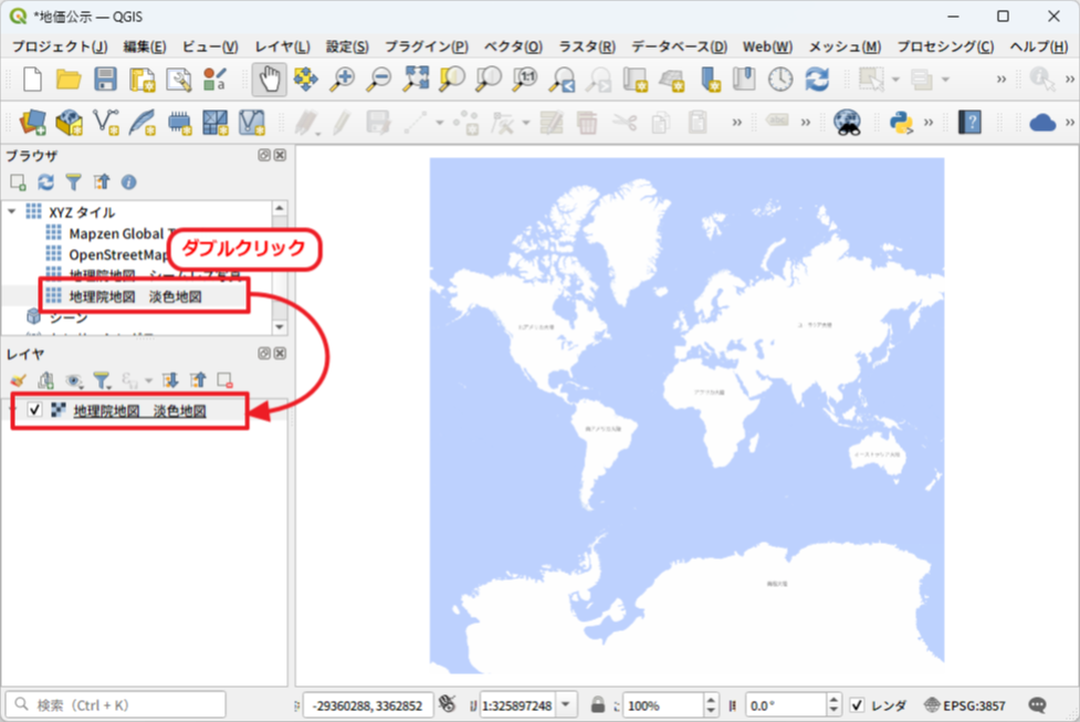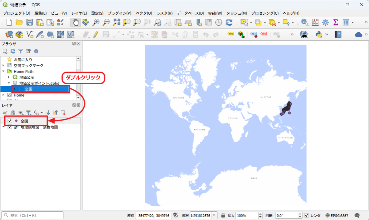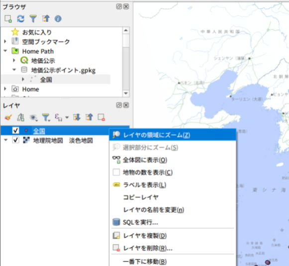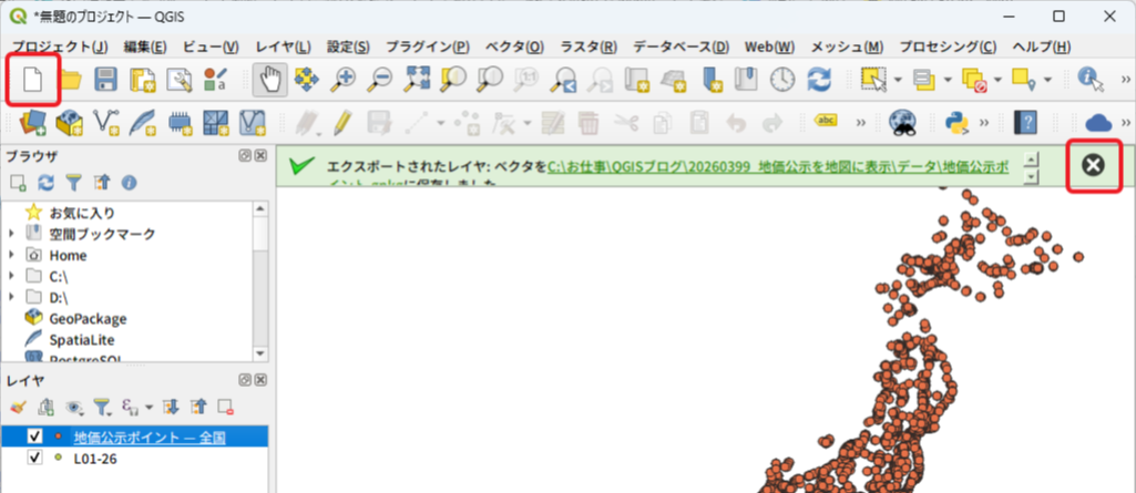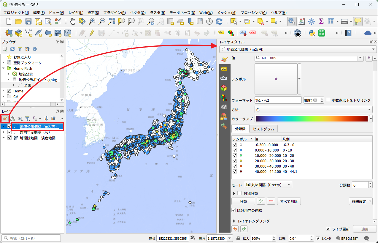 ブラウザパネルから地価公示ポイントをレイヤに追加する