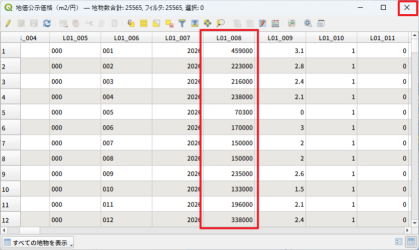 確認したら、右上の「✕」で属性テーブルは閉じておきます。