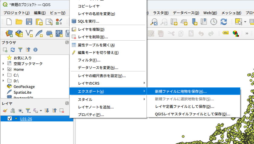 そのために、シェープファイルをQGISの標準ファイルである「Geopackage」(ジオパッケージ)に変換しておきます。