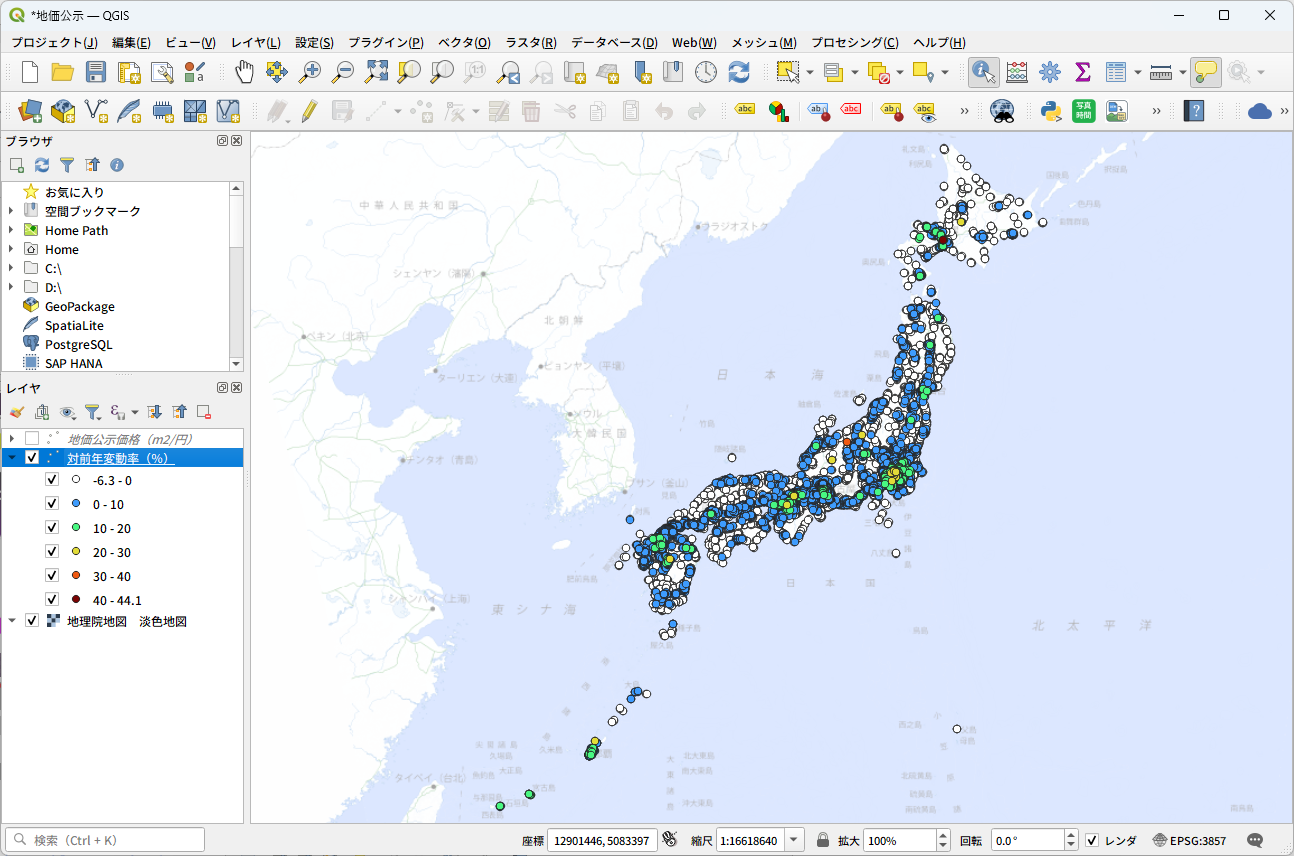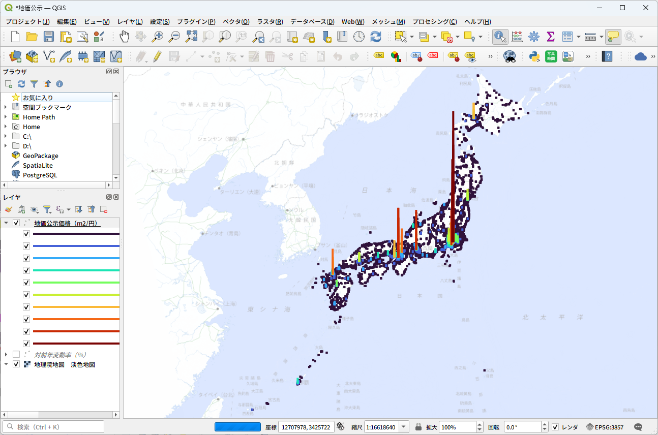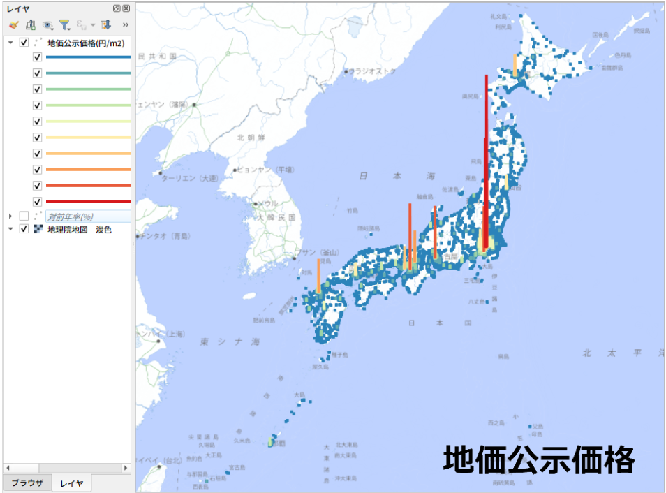 そんなときは、QGISで地価公示データを表示することで、全国の地価の状態を俯瞰的に見ることができます。