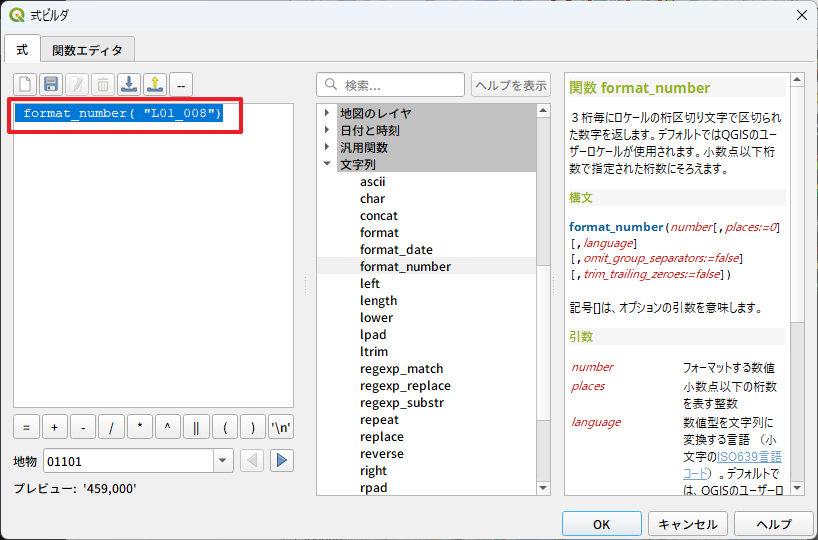 式に「format_number( "L01_008")」と入力すると、数値を3桁区切りで表示できます。