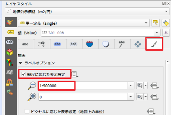 今回は「1:500,000」(50万分の1)と入力します。50万分の1よりズームしたときにラベルを表示します。(縮尺は適宜見やすい値に変更してください)