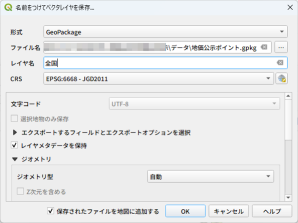 ファイル名の右の「・・・」ボタンをクリックし、あらかじめ作成しておいた保存用フォルダに「地価公示ポイント.gpkg」というファイルで保存します。