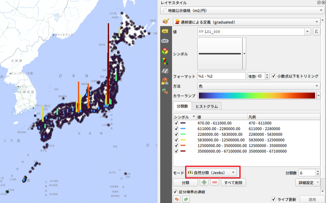 「モード」を「自然分類(Jenks)」に変更します。分類された値が更新されて、地図上に棒グラフが表示されます。
