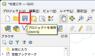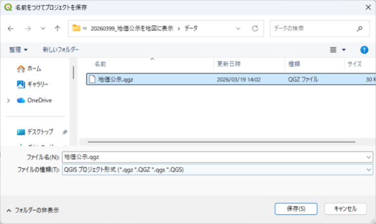 プロジェクトファイルの保存場所は、先に「地価公示ポイント.gpkg」を保存したフォルダと同じフォルダかそれよりも上位のフォルダに保存します。