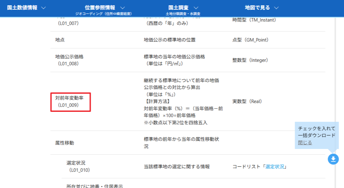 国土数値情報ダウンロードページに記載されている「対前年変動率」のフィールド名は「L01_009」となっています。