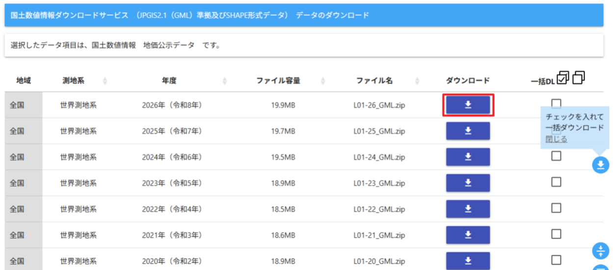 令和8年版だと、「L01-26_GML.zip」がダウンロードされます。