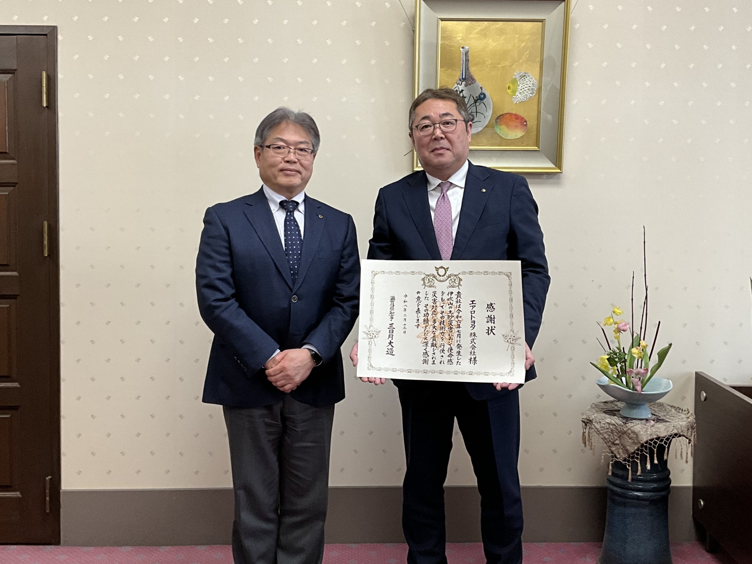 エアロトヨタ株式会社(代表取締役社長:加藤浩士、本社:東京都江東区)は、「令和六年七月に発生した伊吹山の土砂災害において使命感をもって、その技術力を行使され災害対応に多大な貢献をされた」として、滋賀県より感謝状を拝受いたしました。
