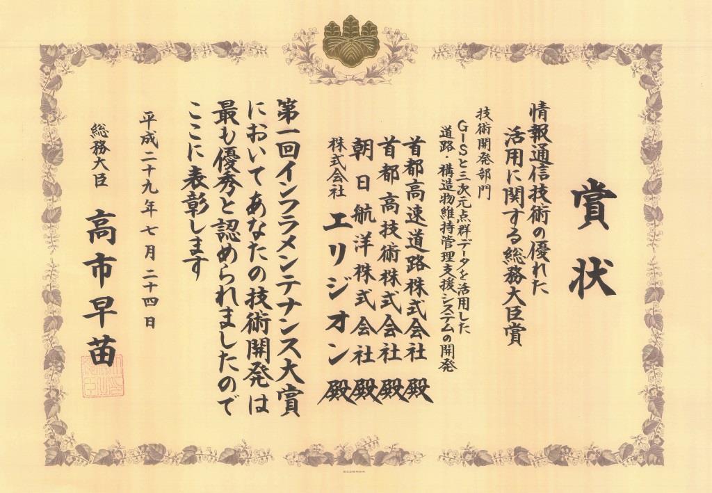朝日航洋株式会社(本社:東京都江東区、代表取締役社長:尾暮敏範)、首都高速道路株式会社、首都高技術株式会社および株式会社エリジオンで共同開発した、GISと点群データを活用した道路・構造物維持管理支援システム『InfraDoctor』が、第1回インフラメンテナンス大賞において「情報通信技術の優れた活用に関する総務大臣賞」を受賞しました。