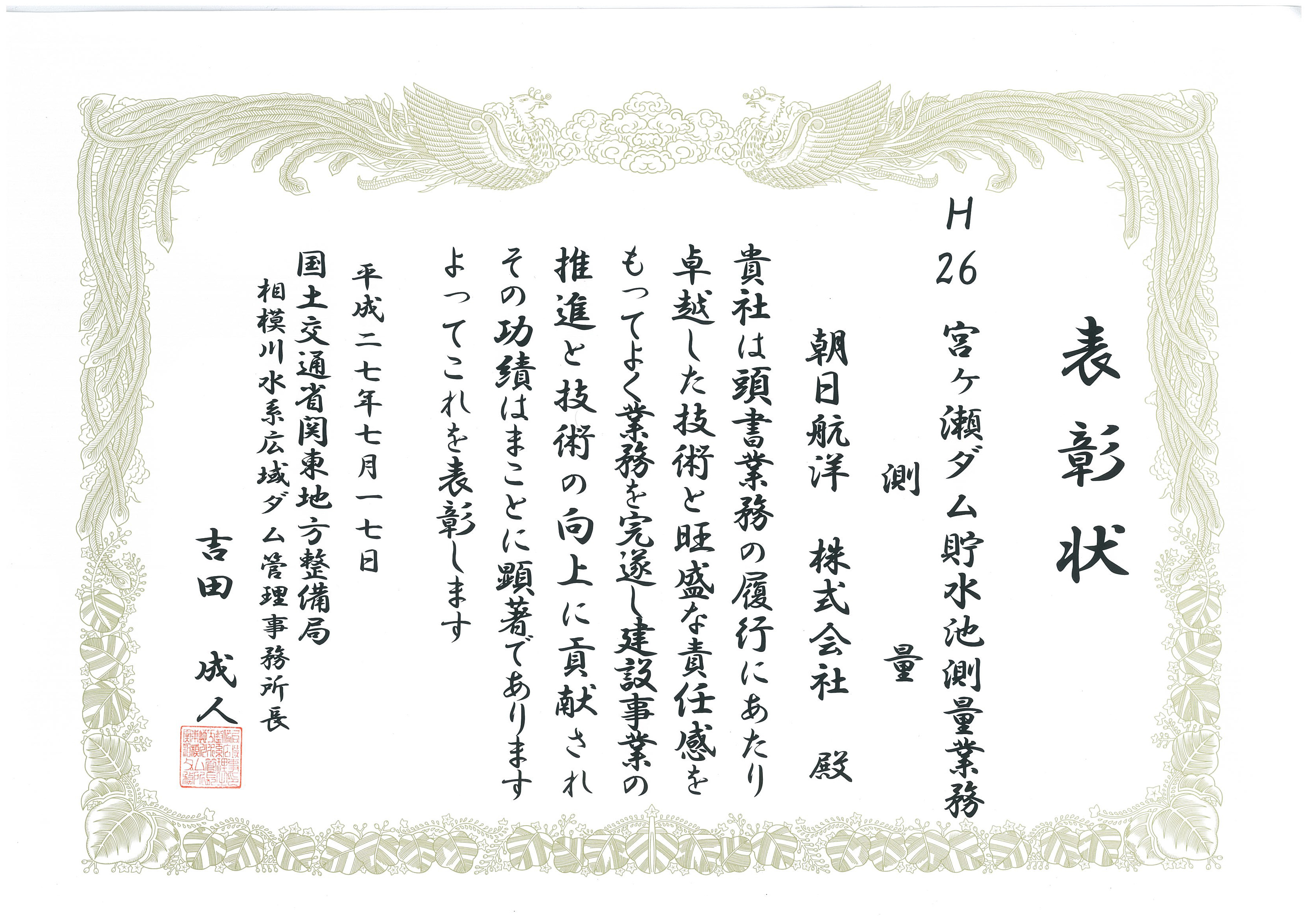 平成27年7月17日、国土交通省関東地方整備局相模川水系広域ダム管理事務所は、平成26年度に完成した工事、完了した業務の中で特に優れた成績を収めた工事、業務、技術者等について、平成26年度事務所長表彰を行いました。