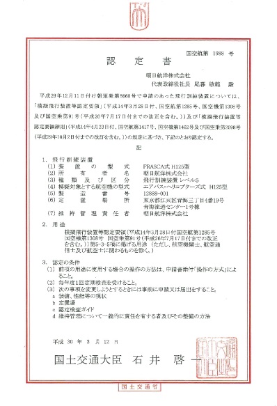 この装置は、国土交通大臣より「飛行訓練装置レベル5」の認定を受けております。
