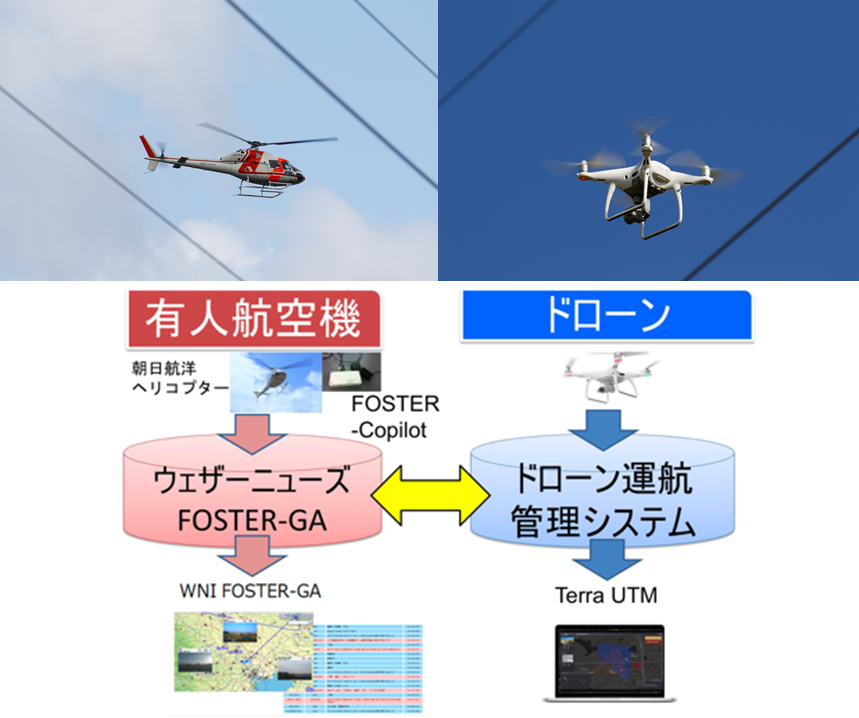 朝日航洋社が保有している有人ヘリコプターと電力施設点検及び運航管理のノウハウとテラドローン社が提供しているドローン運航管理システム“TerraUTM”と、ウェザーニューズ社が提供している有人ヘリコプター運航管理システムFOSTER-GA/機上システムFOSTER-NAVとの連携により、有人ヘリコプターとドローン間の衝突回避の有効性を確認することができました。