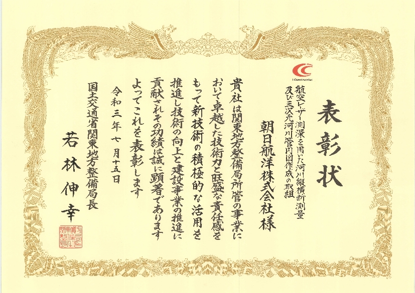 朝日航洋株式会社(本社:東京都江東区、代表取締役社長:尾暮敏範)は、国土交通省関東地方整備局による『令和3年度 新技術推進技術者・新技術大賞局長表彰』において、「新技術推進技術者」の局長表彰を受賞いたしました。