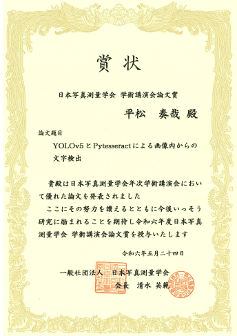 日本写真測量学会 令和6年度年次学術講演会において「学術講演会論文賞」を受賞しました