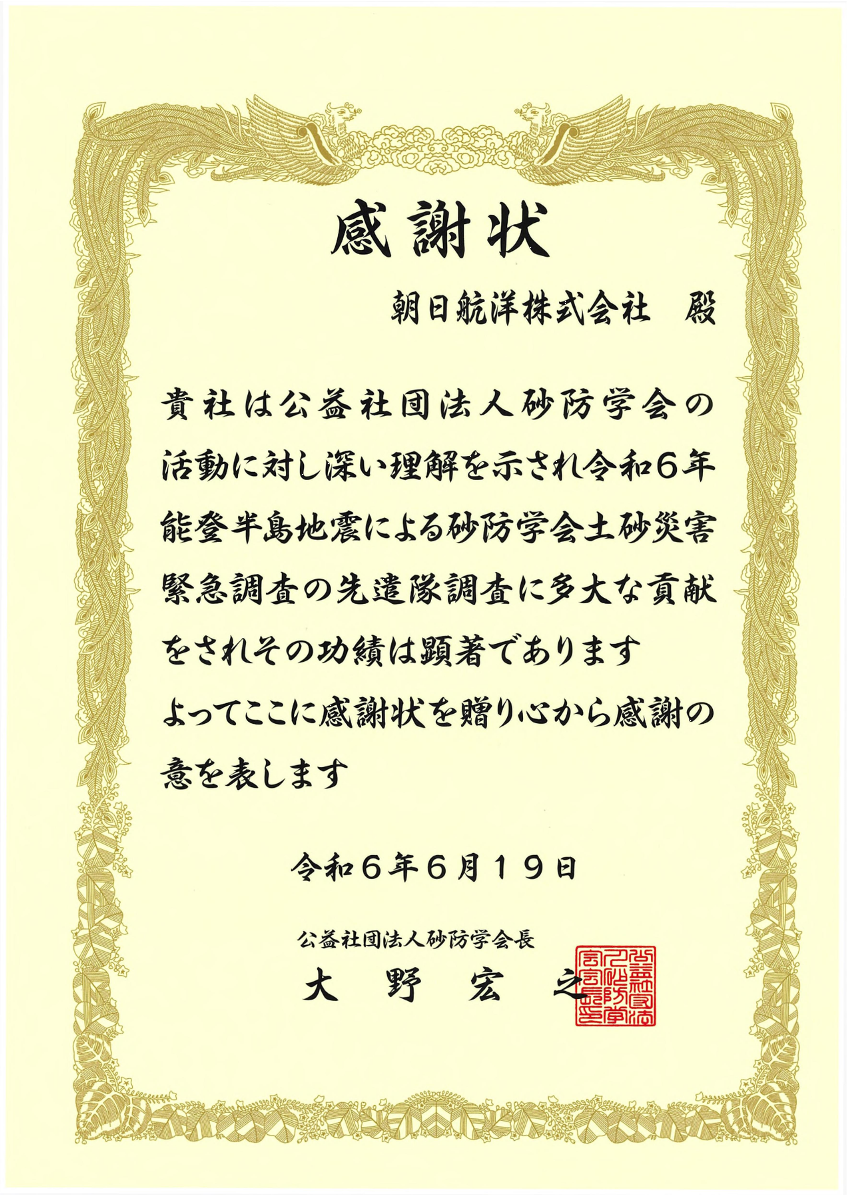 朝日航洋株式会社(本社:東京都江東区、代表取締役社長:加藤浩士)は、令和6年1月に発生した能登半島地震の迅速な被災状況等調査に貢献したとして、公益社団法人砂防学会より感謝状を拝受しました。