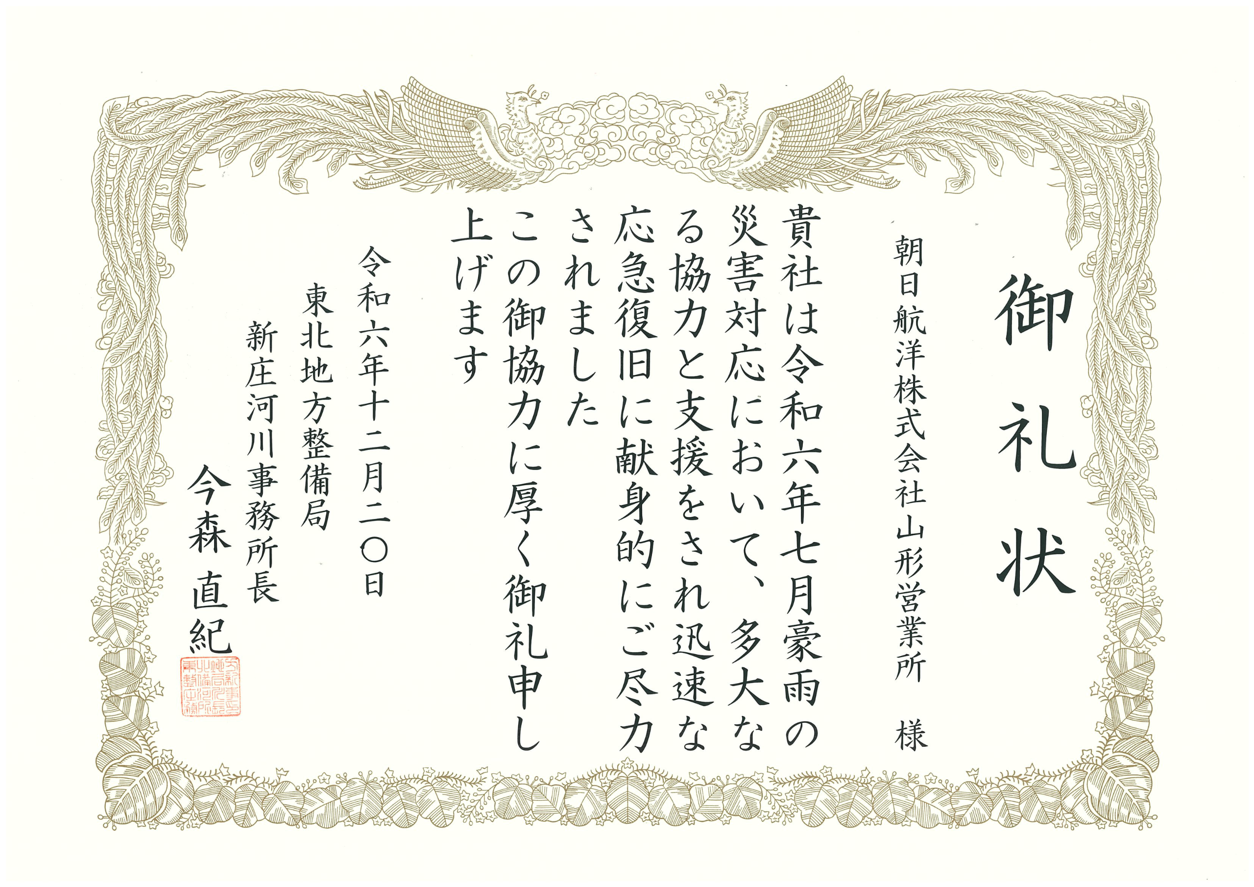 朝日航洋株式会社(代表取締役社長:加藤浩士、本社:東京都江東区)は、令和6年7月豪雨で発生した災害において、迅速な応急復旧等に尽力したとして、国土交通省東北地方整備局 新庄河川事務所長より御礼状を拝受いたしました。