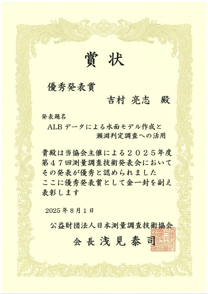 日本測量調査技術協会 第47回測量調査技術発表会において優秀発表賞を受賞しました