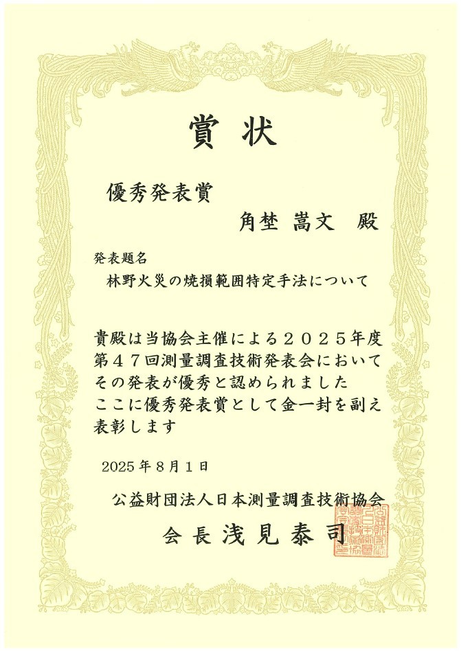 - 日本測量調査技術協会 第47回測量調査技術発表会において優秀発表賞を受賞しました