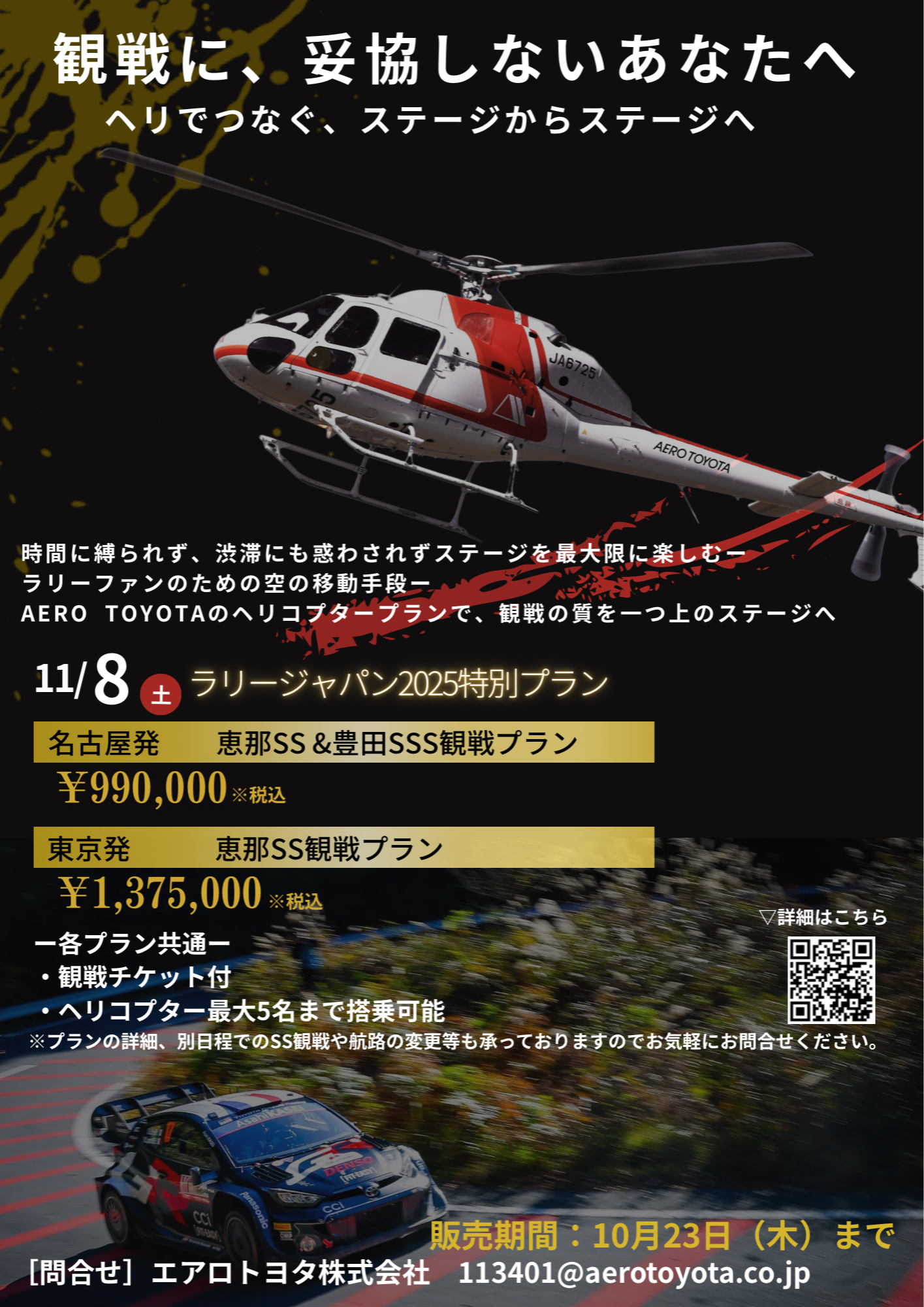 エアロトヨタ株式会社(本社:東京都江東区、代表取締役社長 加藤浩士)は、2025年11月6日(木)~11月9日(日)に開催される「ラリージャパン2025」にて、ヘリコプターで観戦会場へ移動するプランを販売いたします。