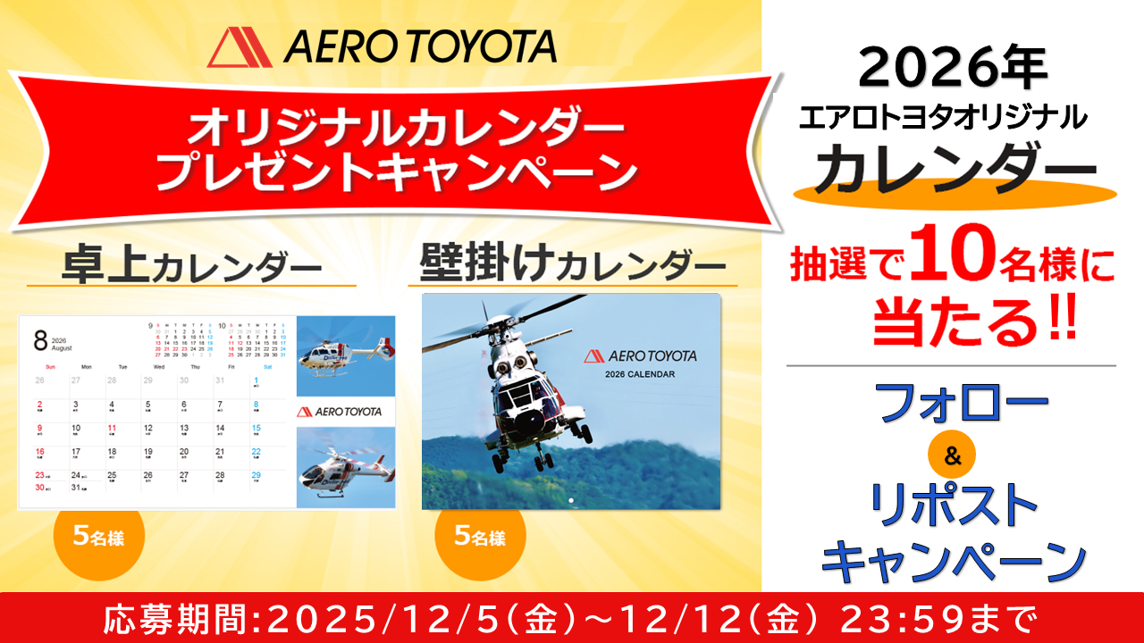 エアロトヨタ株式会社(代表取締役社長:加藤浩士、本社:東京都江東区)は、X(旧Twitter)でエアロトヨタ公式アカウント(@aerotoyota_1955)をフォロー&リポストしてくださった方の中から抽選で10名様に、エアロトヨタオリジナルカレンダーをプレゼントするキャンペーンを本日12時より開始いたします。