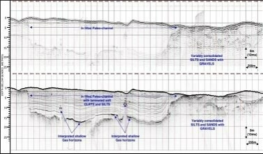 特にチャープ方式で、500Hzまでの低周波で探査できるため、海底下20m程度(砂地層のケース)までの地層を高分解能に捉えることができます。