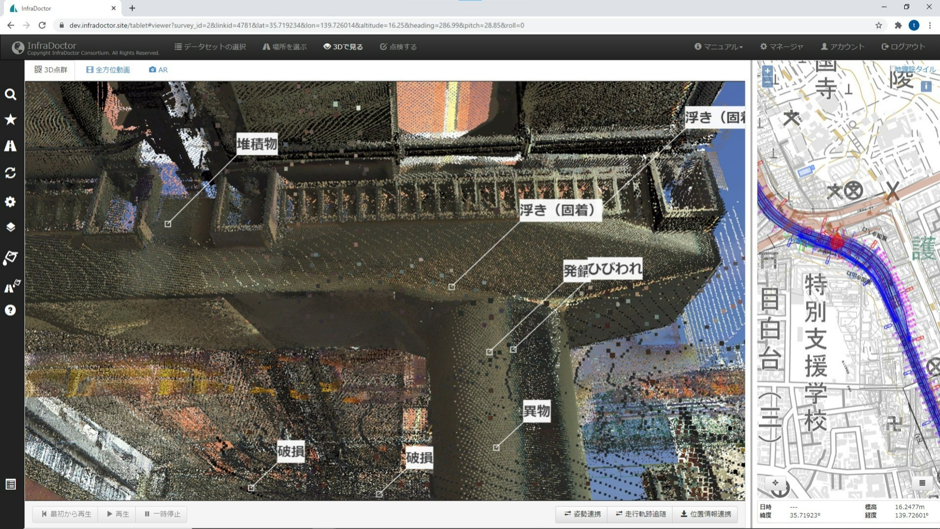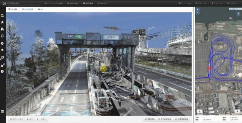 インフラドクターは、3次元点群データと全方位動画、各種台帳データや地図データをクラウド上のWebGISに搭載し、道路・鉄道・空港などインフラ構造物の維持管理を支援するシステムです。